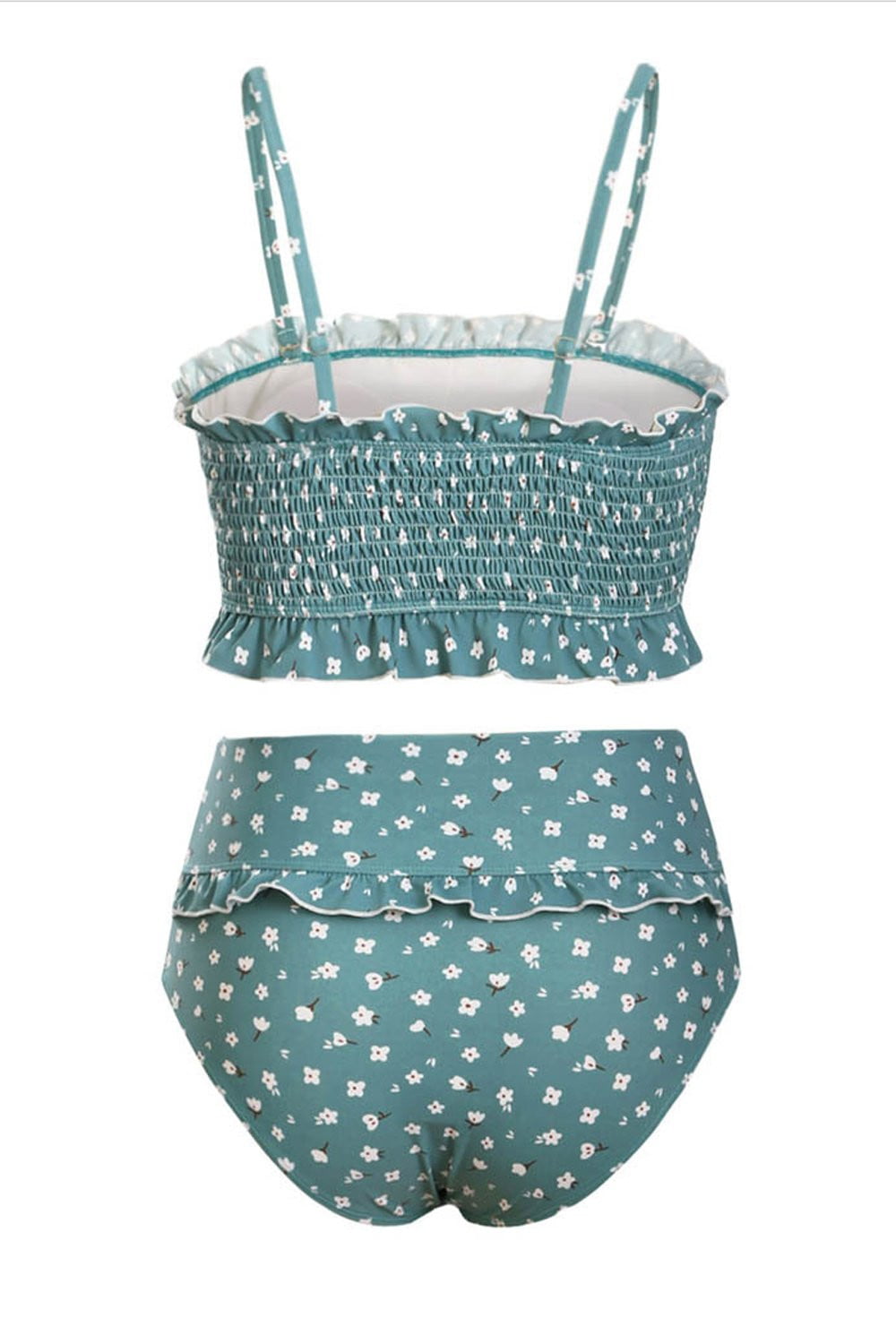Light Blue Floral Smocked Ruffle Trim Bandeau Bikini Top