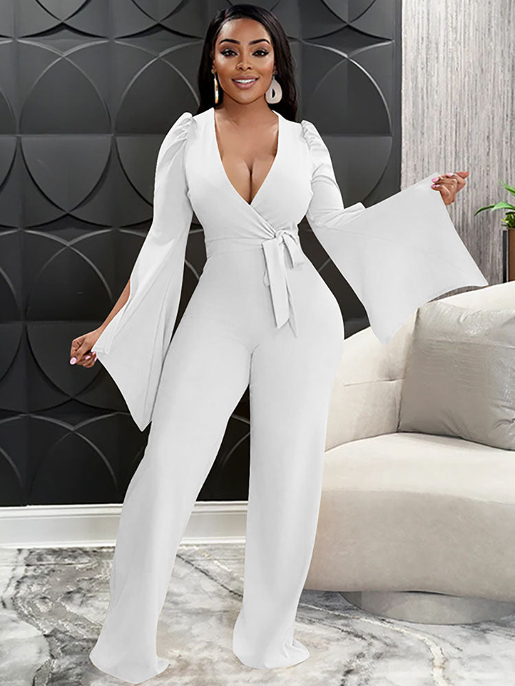 Features: Long sleeve. split. deep v-neck. tie up. solid color. sexy. wide leg. jumpsuits.