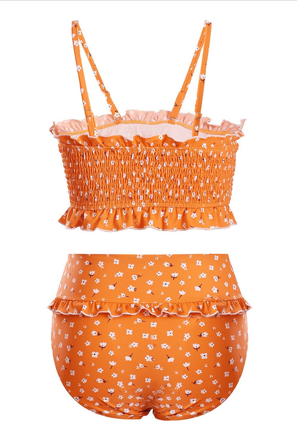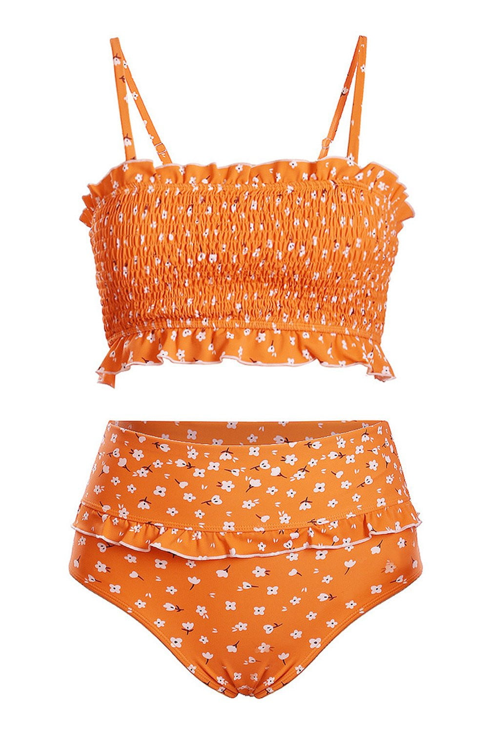 Orange Floral Smocked Ruffle Trim Bandeau Bikini Top