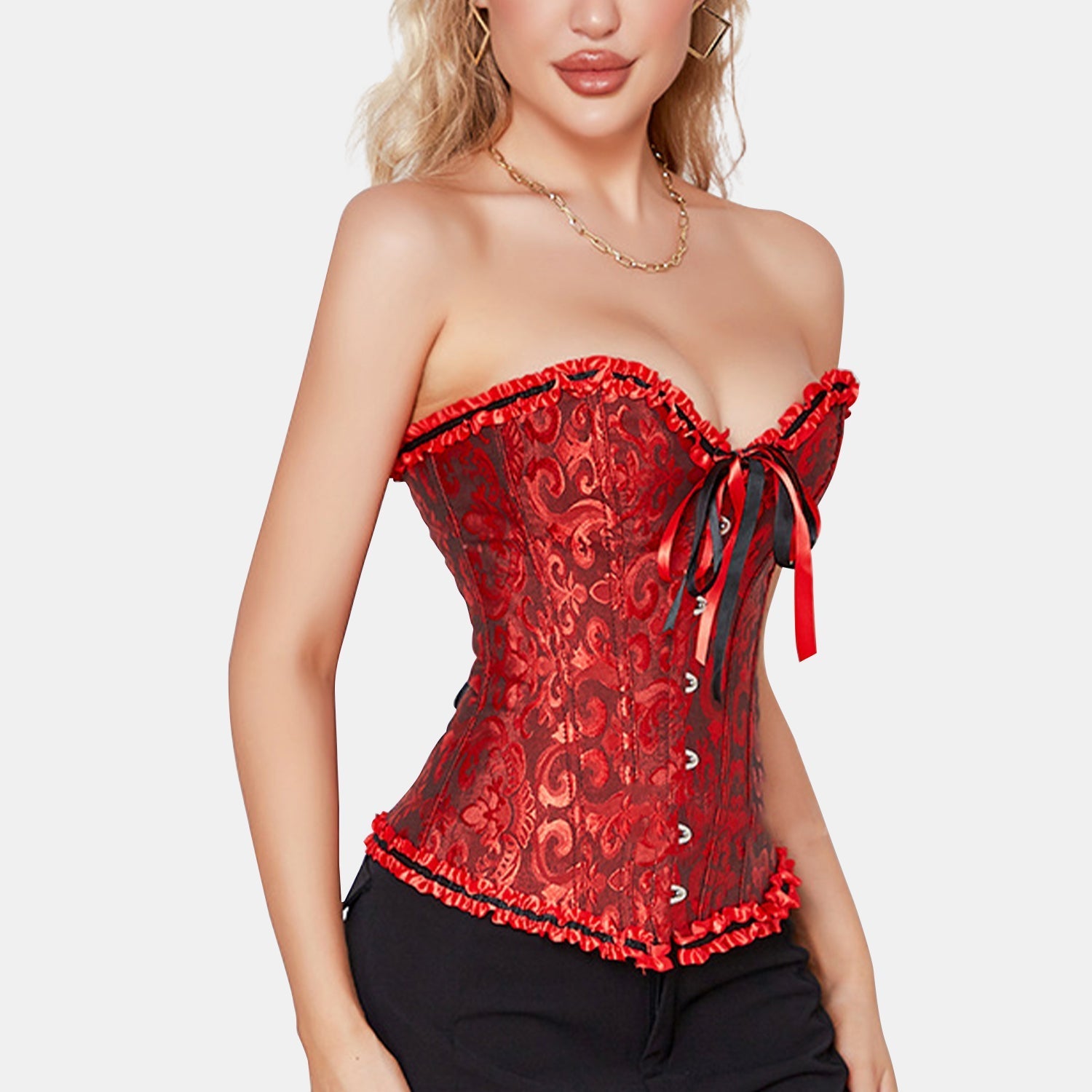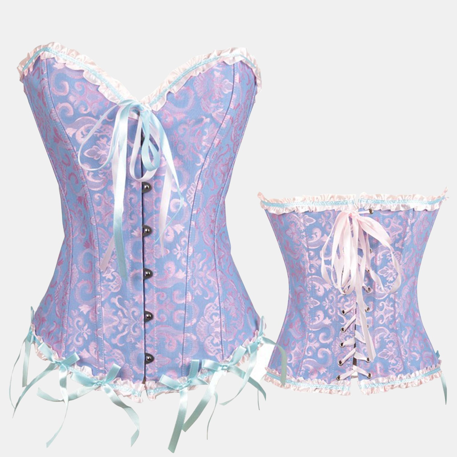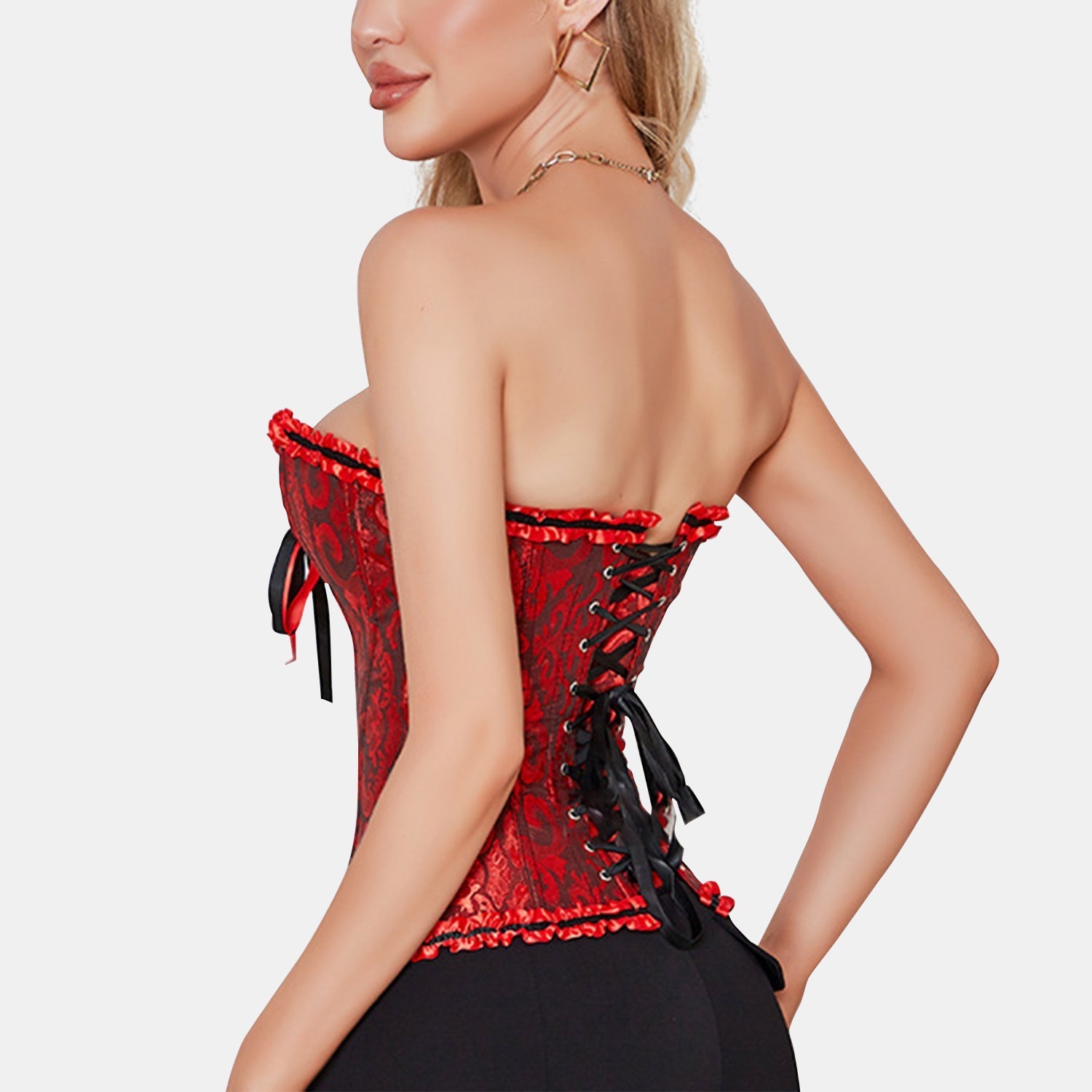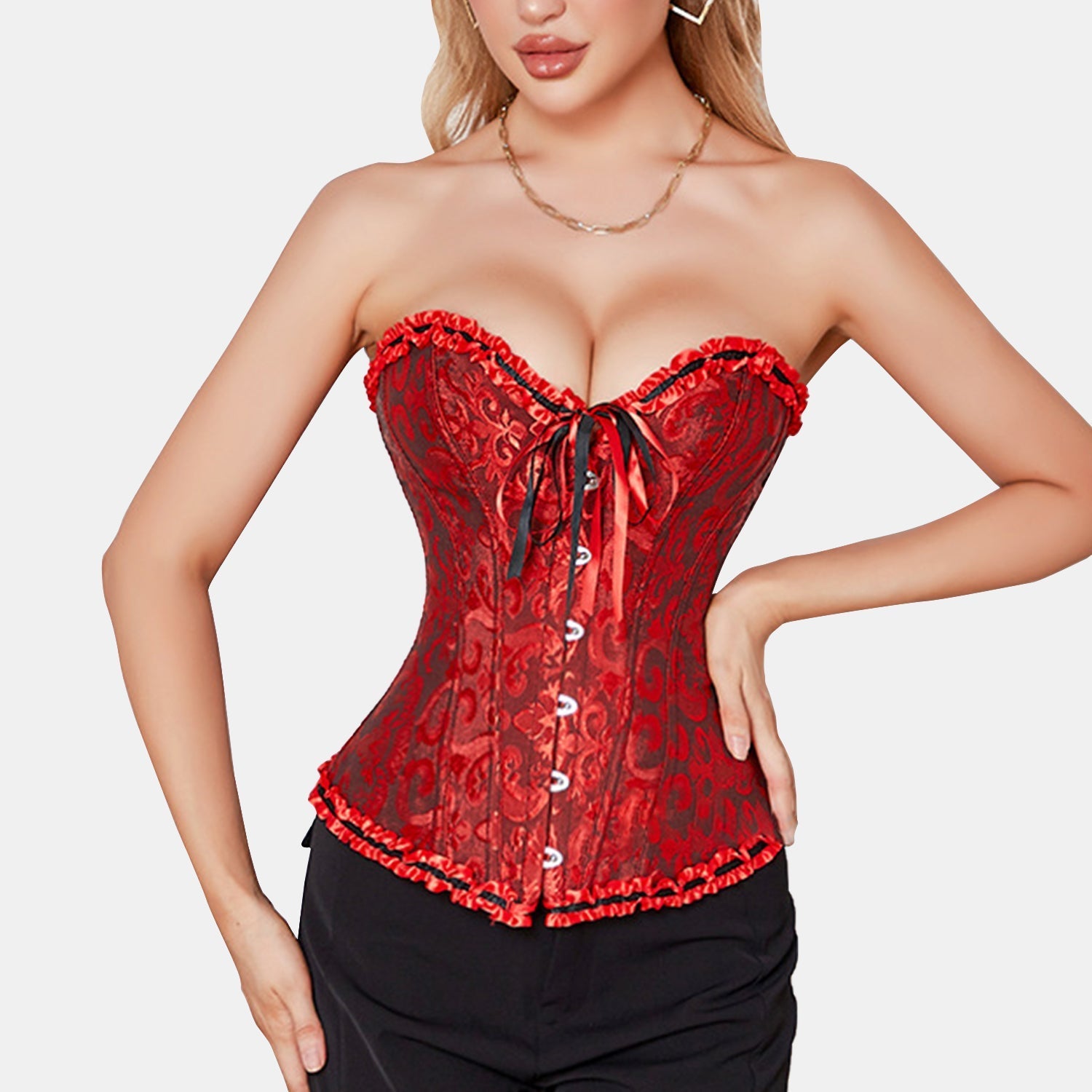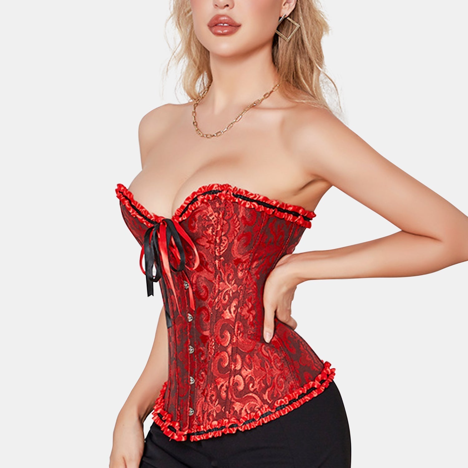 This stunningly overbust is the perfect corset to celebrate your love of Gothic and Steampunk style. Fetching ruffles along the bustline and across the hem add a touch of femininity and all this is topped off with a pretty bow at the centre of the bustline. Pair it up with a pair of jeans or a long flowing skirt depending on your preference and the style you wish to create. It features with the printing pattern. flexible boning to support. It fully show the lines of the waist and chest. Its overbust design beautifully sculpts the silhouette. offering excellent support and a flattering hourglass look.