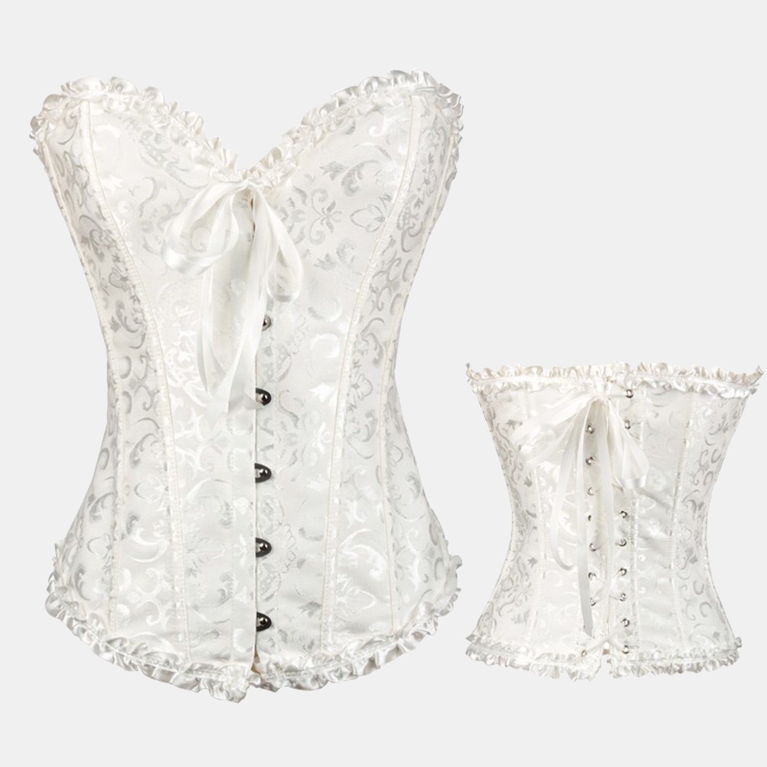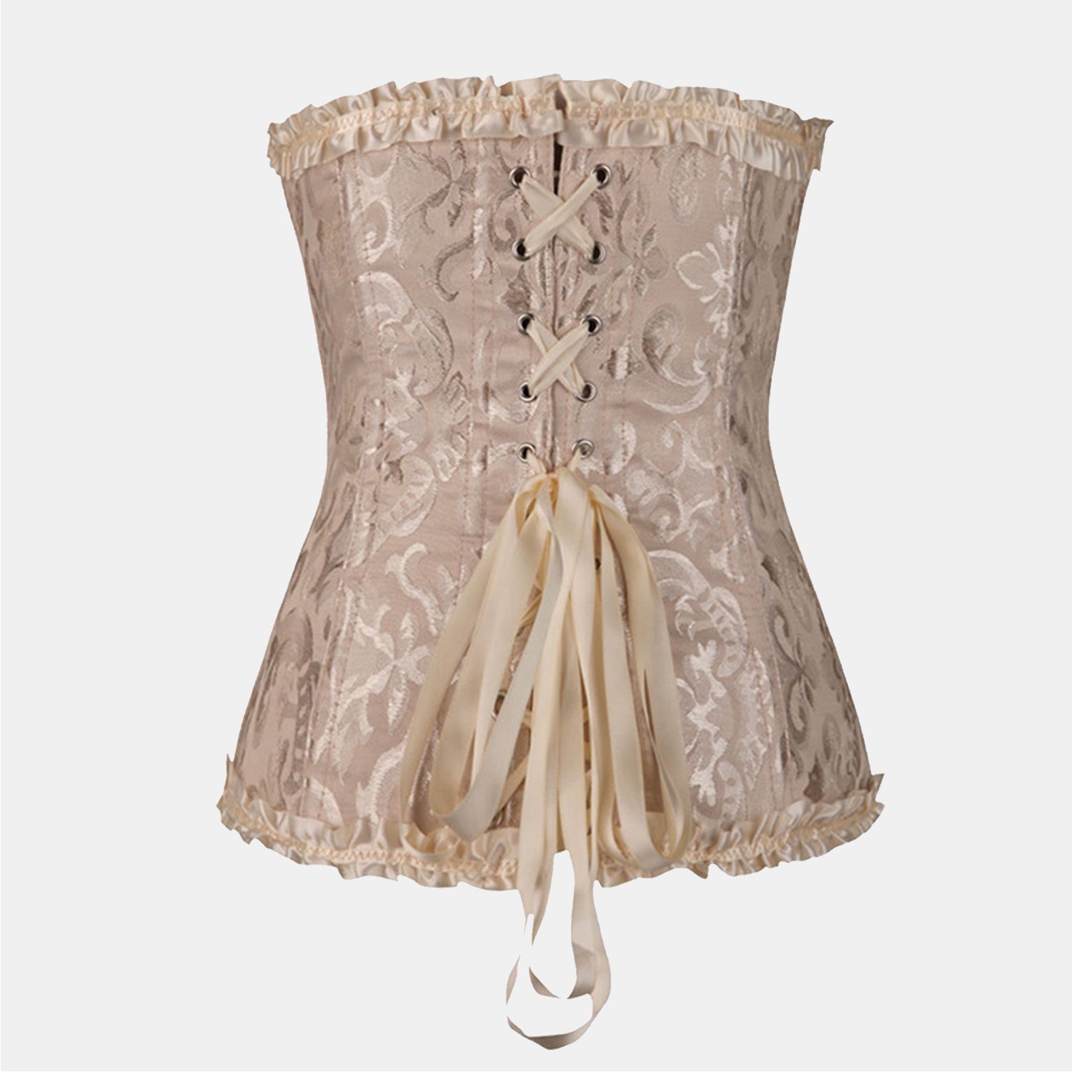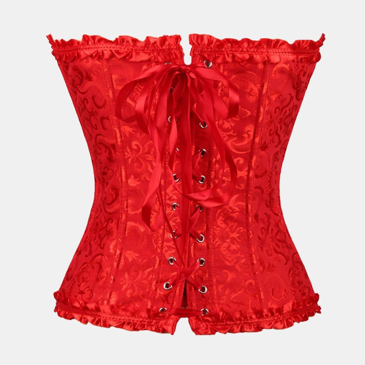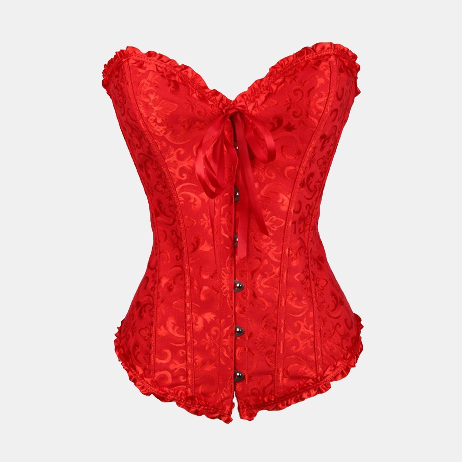 This stunningly overbust is the perfect corset to celebrate your love of Gothic and Steampunk style. Fetching ruffles along the bustline and across the hem add a touch of femininity and all this is topped off with a pretty bow at the centre of the bustline. Pair it up with a pair of jeans or a long flowing skirt depending on your preference and the style you wish to create. It features with the printing pattern. flexible boning to support. It fully show the lines of the waist and chest. Its overbust design beautifully sculpts the silhouette. offering excellent support and a flattering hourglass look.