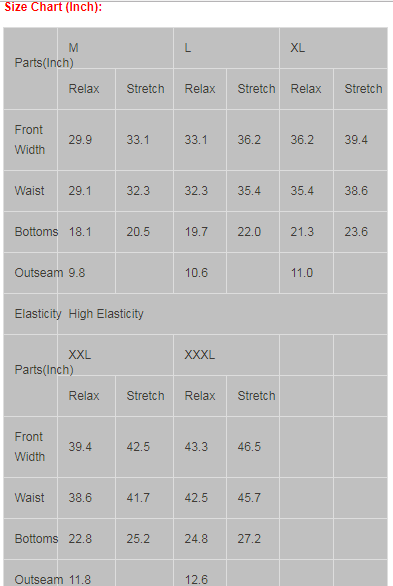 | Waist | 29.1 | 32.3 | 32.3 | 35.4 | 35.4 | 38.6 |