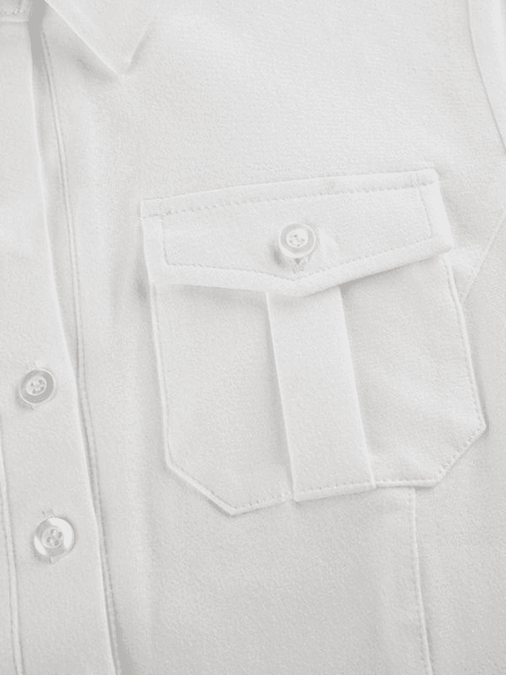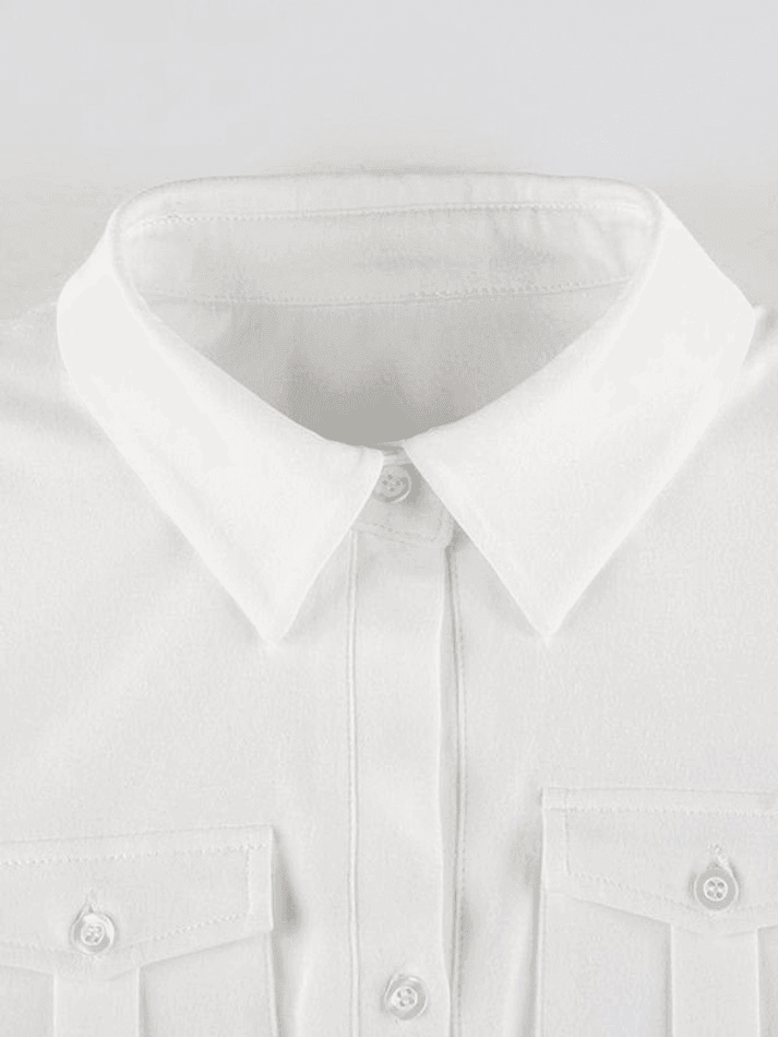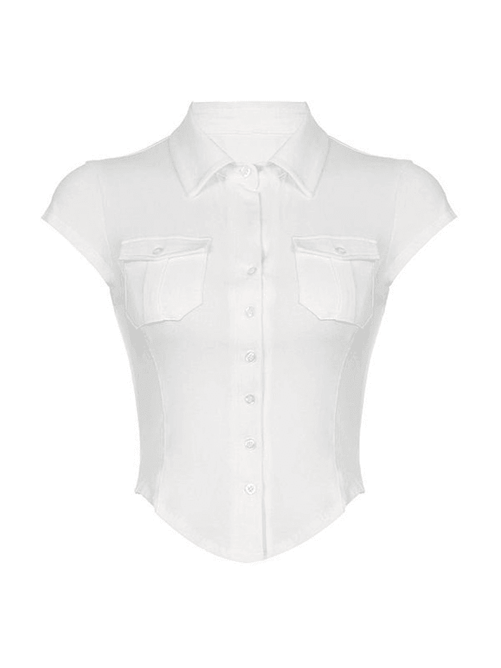 Description: Elevate your wardrobe with this cute and chic cropped blouse. Its slim fit and turndown collar exude casual yet trendy vibes. The short sleeves. button front closure. and curvy hem design make it a must-have for fashion-forward Gen Z. Complete with convenient chest pockets for added functionality.