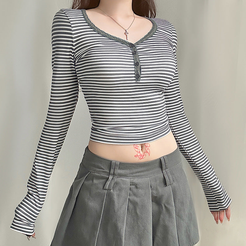 Description: Y2K trend has endured for fall-winter seasons. These knit tops are suits for go-to vibes or stay around the house. Designed with striped pattern throughout the body. features contrast collar & cuffs. and stitched seam detail.